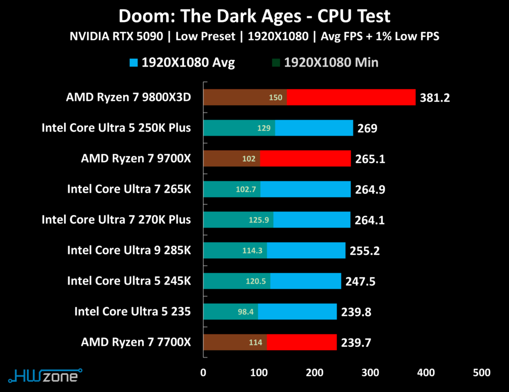 ב-Doom האחרון ביצועי המעבדים שמאחורי 9800X3D נשארים כמעט זהים. יש למעבדי אינטל החדשים יתרון דווקא בכמות הפריימים המינימלית לשניה שנמדדה ולכן יש לשניהם יתרון על פני ה-9700X במבחן זה.