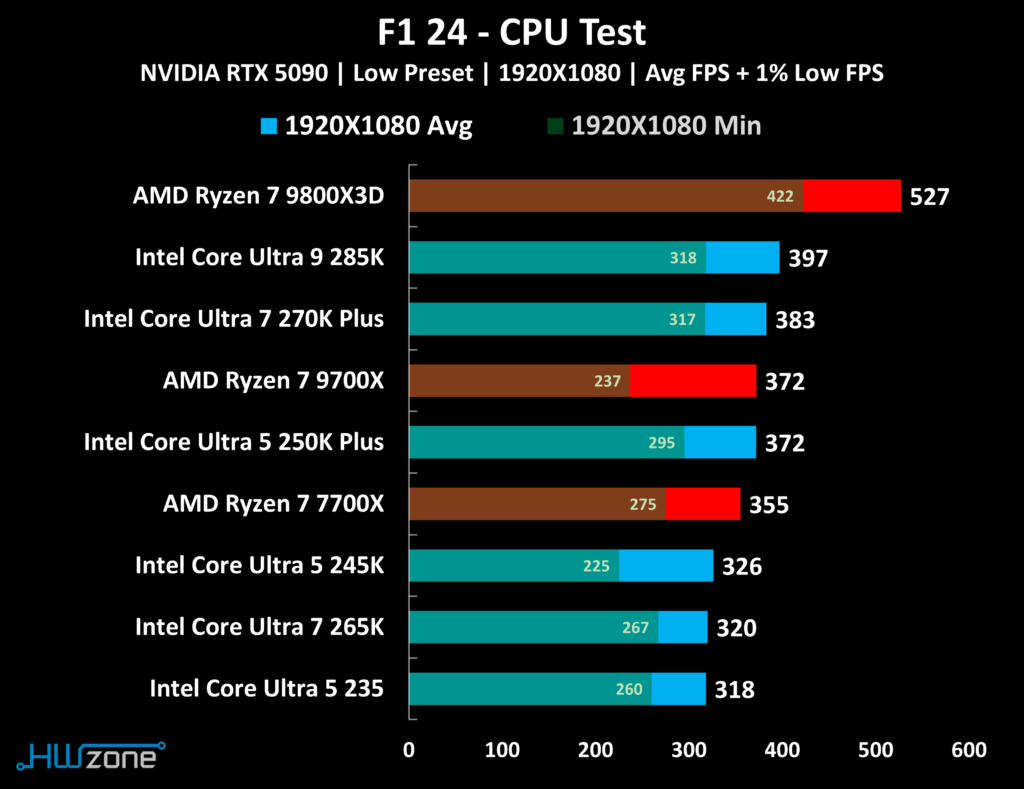במשחק המירוצים F1 24 כמות הפריימים לשניה שהפיק ה-270K Plus גבוהה מזאת של ה-9700X. למעשה, גם ה-250K Plus הביא לביצועים טובים מאשר אלו של 9700X בכותר הזה בהתחשב במינימים שנמדד. מדובר בשיפורים מאוד יפים על פני ה-265K וה-245K בהתאמה. לא רע.