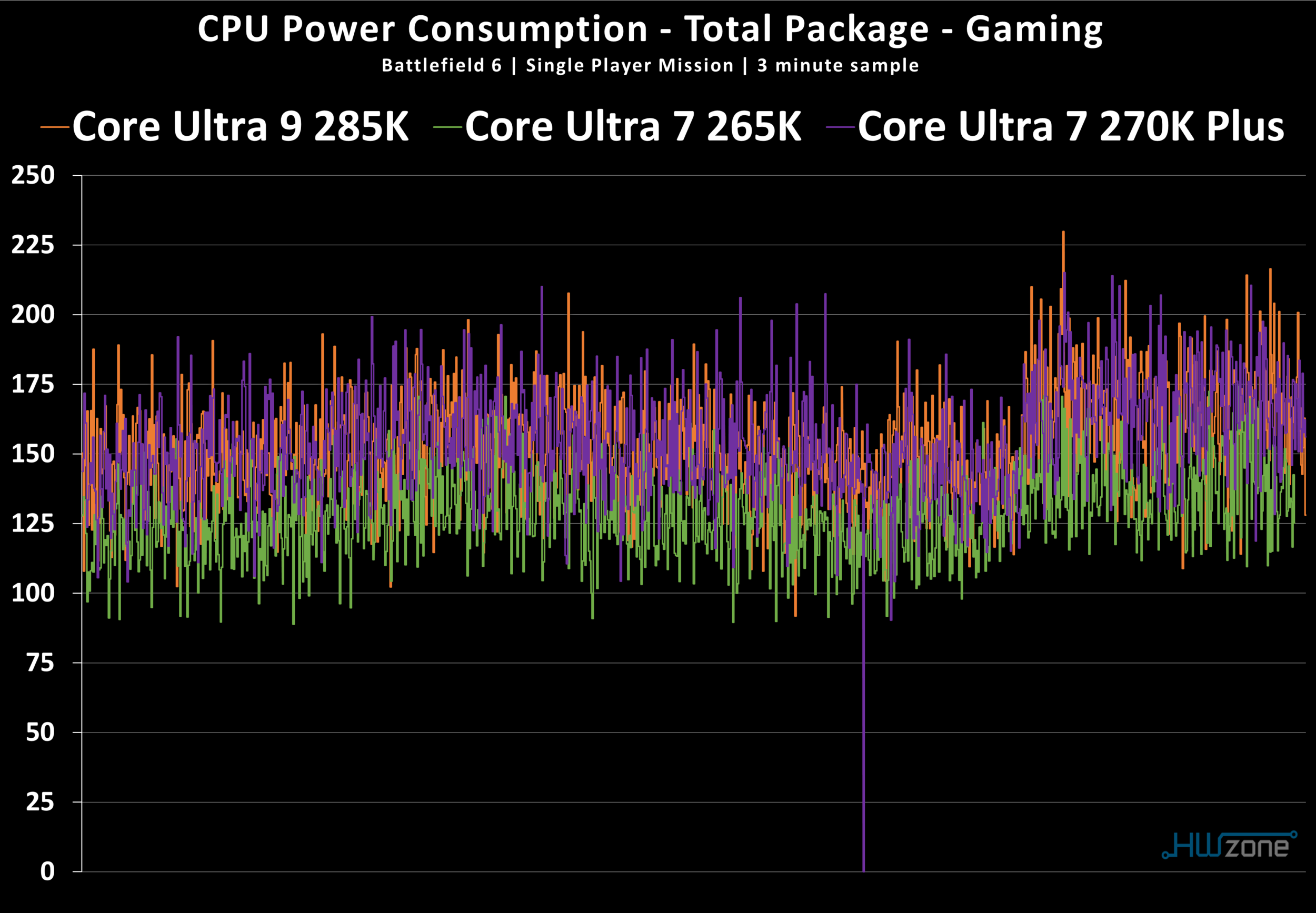 כשמביטים על צריכת החשמל בגיימינג, ספציפית ב-Battlefield 6 שהוא כותר יחסית אינטנסיבי למעבדים, אפשר לראות שלא נמדד שיפור יוצא דופן ביעילות ה-270K Plus (הגרף הסגול). מדובר באותם 125-180W בעת מאמץ בגיימינג שאנחנו רואים עם ה-285K. ה-265K דווקא מראה צריכת חשמל נמוכה בכ-25W משניהם, אבל גם מביא לפחות ביצועים.