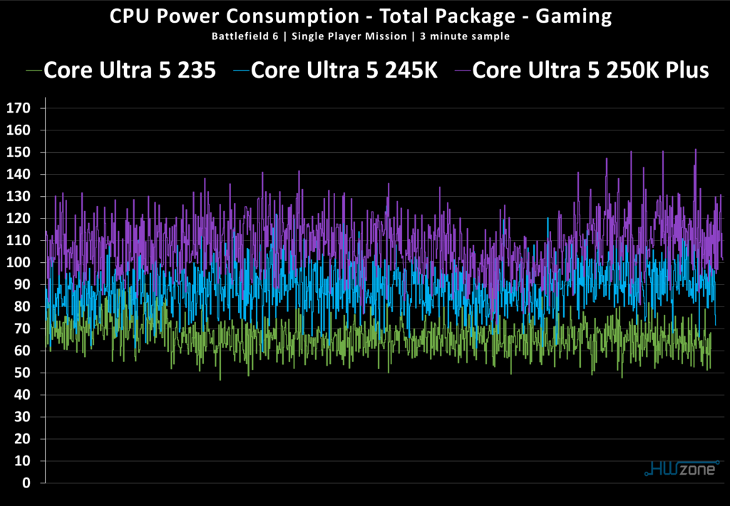 מעבדי האמצע של אינטל צורכים משמעותית פחות חשמל, כאשר ה-Core Ultra 5 235 נשאר באיזור ה-65W בעת מאמץ במשחק. ה-250K Plus מציג צריכת חשמל ממוצעת של כ-110W במצב הזה. לא, לא מדובר במעבד יעיל משמעותית מ-245K, למי שמחפש את זה. אחרי הכל, תדרי פעולה גבוהים יחד עם ניצול חזק יותר של החומרה באותו תהליך יצור יבוא לצריכת חשמל גבוהה יותר. אין פה הנחות. ישנה עליה של כ-20W מ-245K ל-250K Plus בגיימינג.
