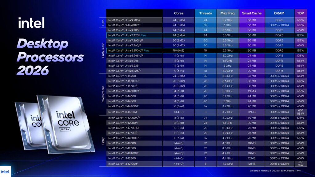כך נראה קו המוצרים החדש של אינטל יחד עם צמד מעבדי Core Ultra 200S Plus כאשר בראש עדיין עומדים ה-Core Ultra 9 285K וה-Core i9 14900K.