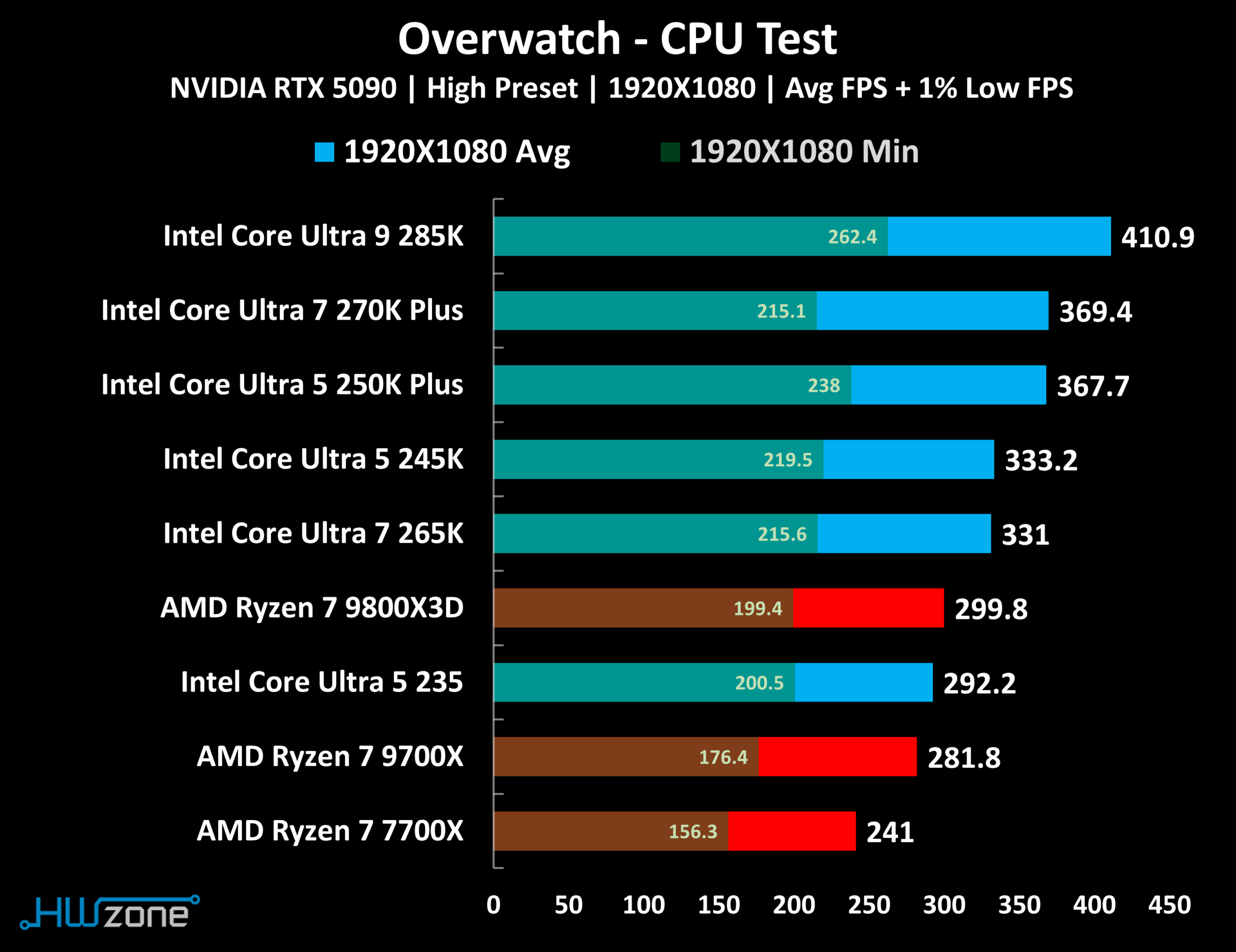 נכון לדרייברים המעודכנים ביותר ולגרסה המעודכנת ביותר של מערכת ההפעלה חלונות 11, יש יתרון ביצועים מאוד מובהק לאינטל ב-Overwatch, דבר שהפתיע אותנו בהתחשב בטבע המנוע הגרפי שמאחוריו. מסתבר שאם אתם רוצים את הביצועים הטובים ביותר במשחק הזה, כל מה שאתם צריכים הוא 285K, או 270K Plus במחיר נמוך משמעותית. את התמורה הטובה ביותר בין כל המעבדים שנבחנו פה מביא ה-250K Plus.