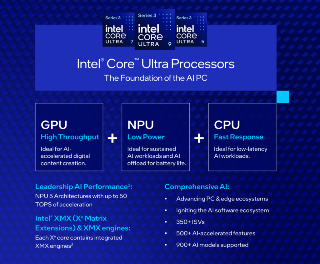 ג'ים ג'ונסון, סגן נשיא בכיר ומנכ"ל קבוצת המחשוב האישי באינטל: "עם סדרת Series 3, אנחנו ממוקדים בשיפור יעילות החשמל, הוספת ביצועי CPU גבוהים יותר, GPU גדול יותר שנמצא בליגה משלו, יותר חישובי AI ותאימות אפליקציות שניתן לסמוך עליה עם ארכיטקטורת x86".