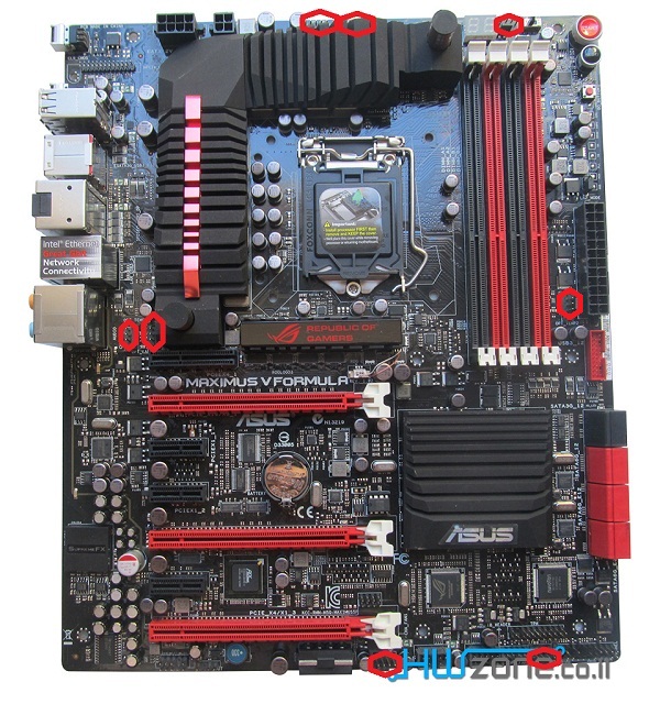 ליד הכפתורים בלוח האם נמצא את הנקודות לבדיקת מתח באמצעות רב-מודד של רכיבים במערכת. אני תמיד בעד העניין, אך אני לא מעריץ את הרעיון של שימוש בתושבות אשר לא עשויות מפלסטיק למחטים של רב מודד. הייתי שמח לראות את אסוס משתמשת בתושבות פלסטיק לצורך זה, בדומה לאסרוק.
