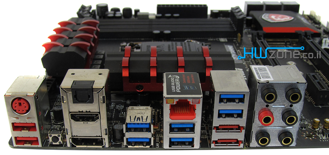 מערך היציאות האחורי כולל (בסדר מימנין לשמאל): שקעי אודיו ב-7.1 ערוצים, מגדל עם שתי יציאות eSATA ושתי יציאות USB 3.0, שתי יציאות USB 3.0 ויציאת רשת RJ45 המתחברת לבקר הרשת Killer E2205, שתי יציאות USB 3.0, יציאות תצוגה HDMI ו-DisplayPort עם יציאת קול אופטית ב-7.1 ערוצים, כפתור איפוס הגדרות ביוס, שני ממשקי USB 2.0 וממשק PS2 משולב למקלדת או עכבר ישנים.לדעתי, מדובר כאן במערך יציאות האופטימלי לגיימר הממוצע. יציאת רשת אחת היא כל שצריך, ממשקי USB 3.0 תמיד מקובלים וחשוב לשמור על תאימות לציוד היקפי, וכאן נכנסים ה-PS2 ויציאות ה-USB 2.0 לתפקיד. ממשקי האודיו יעניקו לכן קול באיכות גבוהה מהסטנדרט. כיצד?בחלקו השמאלי של לוח האם נמצאות אחת מהתכונות החשובות ביותר שלו והיא שבב הקול המובנה.