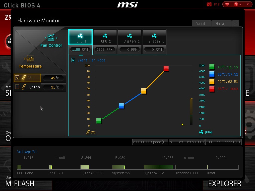 במידה ותרצו להשיג רמת שקט מקסימלית או עוצמת קירור, זה המקום. הכלי מאפשר מתן יחס טמפרטורה לעוצמת פעולה. ישנו חישן טמפרטורה על גבי לוח האם וכמובן אחד במעבד. על פי אחד משני אלה ניתן לקבוע את פרופיל המאווררים.