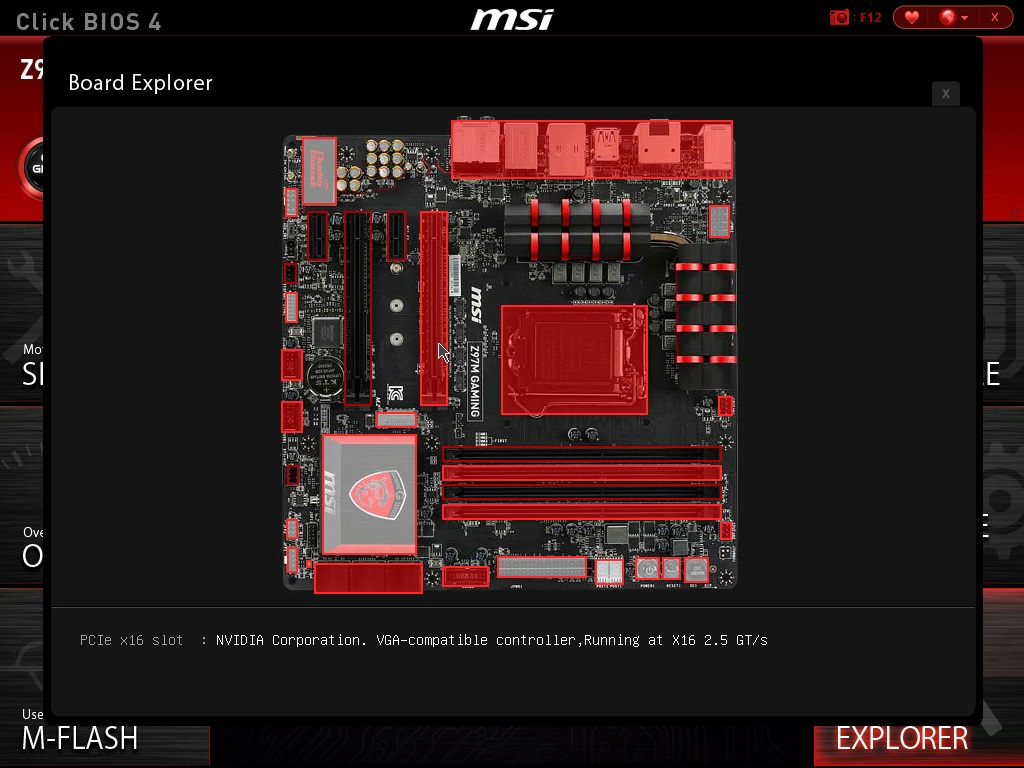 מסך הפתיחה כולל מידע שימושי יחד עם אפשרויות כלליות כמו הפעלת פרופיל XMP והמהרה אוטומטית.כמו בביוסים אחרים, גם כאן ניתן לבצע המהרה באמצעות שינוי תדרי פעולה ומתחים. כל האפשרויות שקיימות בלוחות אם מתקדמים קיימות גם בלוח האם הזה והוא לא חוסך מכם דבר.בין הגאדג'טים של MSI ניתן למצוא בביוס את סייר הלוח ובונה פרופיל המאווררים. סייר הלוח יאפשר לכם לראות חומרה שמחוברת אל לוח האם כאמצעי זיהוי ראשוני, למקרה שלא שחכתם דבר או שישנה חומרה שלא מחוברת כראוי. בונה פרופיל המאווררים מיועדים למאווררים המחוברים אל לוח האם.