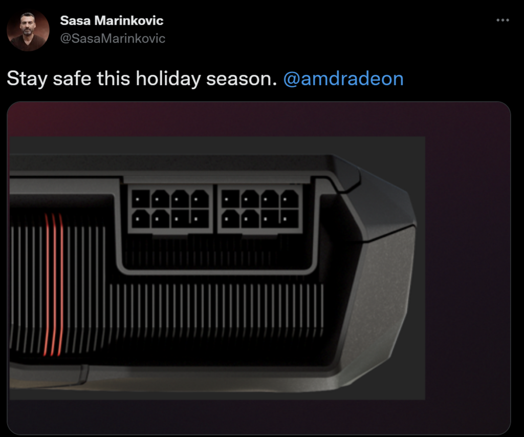 עם ברכה לבבית לעונת החגים המערבית המתקרבת של סוף השנה האזרחית, אחד מבכירי השיווק של מפתחת השבבים דאג לשלומם של הגולשים בתוספת צילום קלוז-אפ של חיבורי ה-8Pin המדוברים – במה שמהווה באופן ברור קריצה לכיוונה של NVIDIA וחיבורי ה-12VHPWR "המסוכנים" שלה. סביר להניח כי אנחנו עוד נחזור לציוץ הזה בהמשך הדרך, כשגם AMD תאמץ בסופו של דבר את חיבורי ה-16Pin החדשים לצד מרבית ספקי הכח, במה שנראה כמו התפתחות בלתי נמנעת בעידן בו צריכת ההספק של הכרטיסים הגראפיים נמצאת במגמת עלייה בלתי פוסקת.