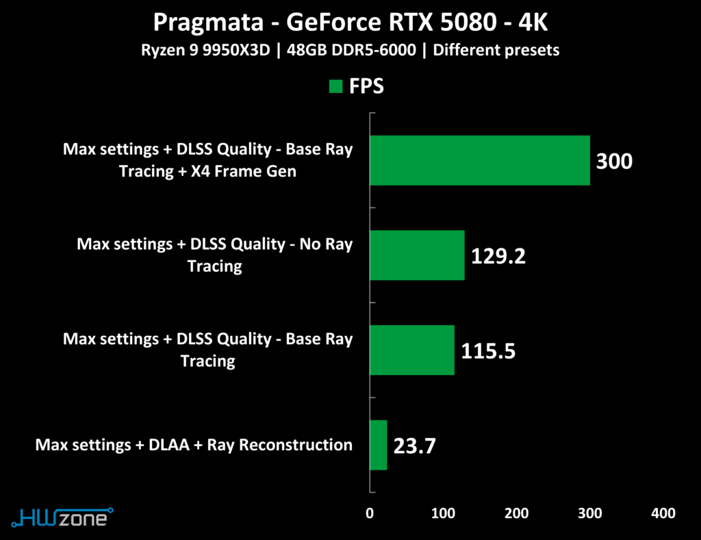 להלן סרטון הדגמה מוקלט מפתחית המשחק בשימוש NVIDIA GeForce RTX 5080 16GB. זו הדגמה של קבלת FPS גבוה בשימוש הגדרות מירביות לצד DLSS Super Resolution במצד Quality. לא נעשה שימוש במצב Ray Reconstruction התובעני.