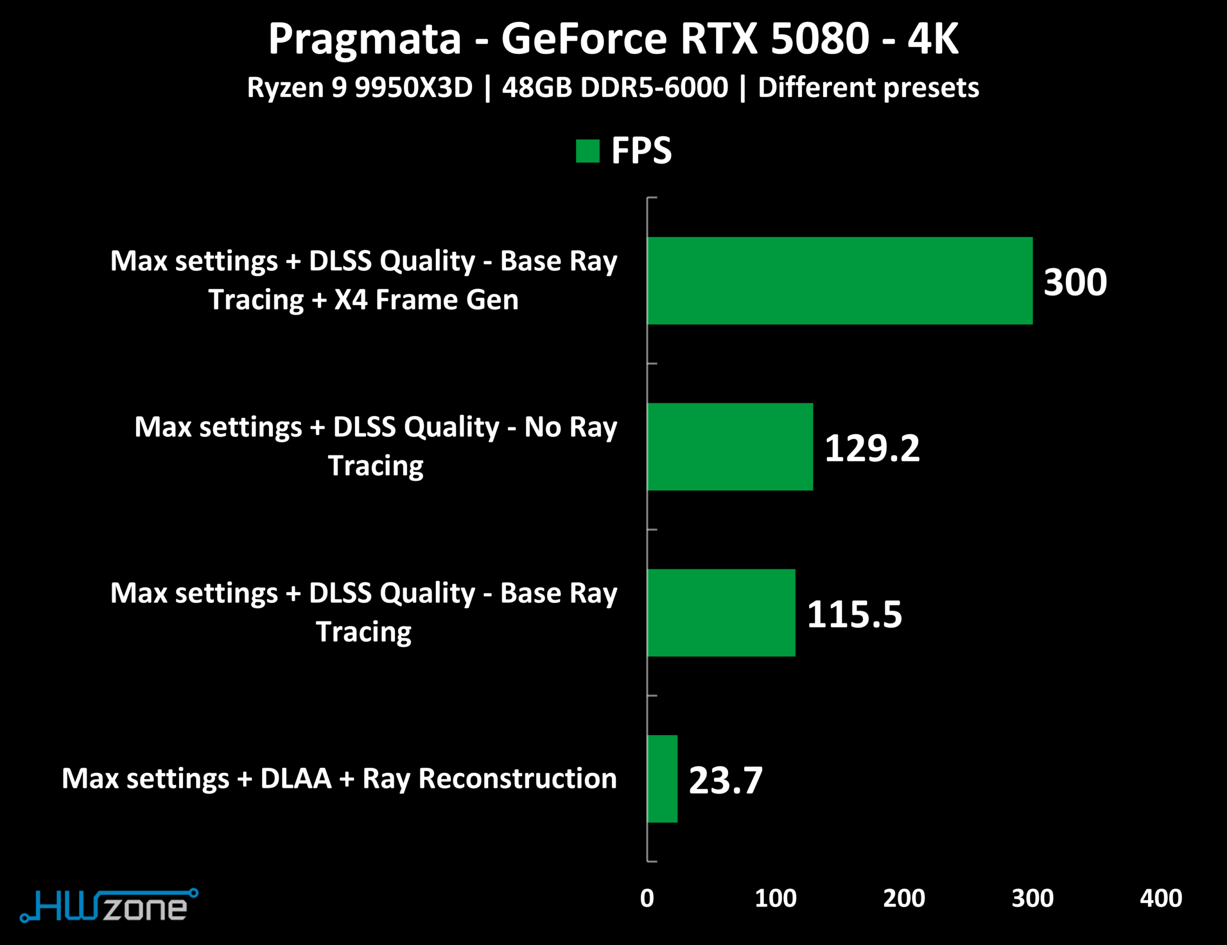 להלן סרטון הדגמה מוקלט מפתחית המשחק בשימוש NVIDIA GeForce RTX 5080 16GB. זו הדגמה של קבלת FPS גבוה בשימוש הגדרות מירביות לצד DLSS Super Resolution במצד Quality. לא נעשה שימוש במצב Ray Reconstruction התובעני.