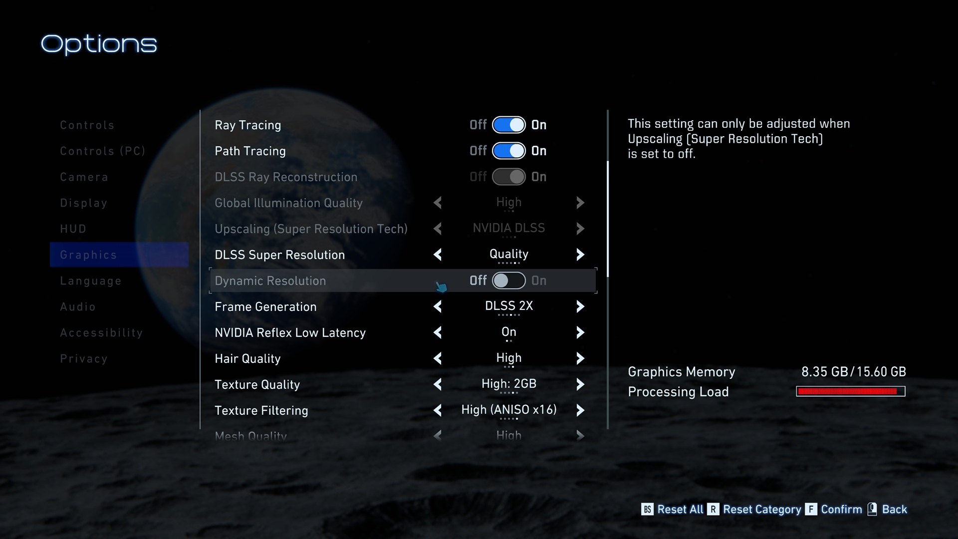 בהגדרות המשחק אפשר למצוא את כל מה שאפשר לצפות ממשחק שהותאם למחשב האישי. יש הגדרות עקיבת קרניים (RayTracing) ואפילו אפשרות לשימוש בתאורה מציאותית הרבה יותר, Path Tracing. המשוגעים לדבר אפילו ישתמשי בטכנולוגיית ה-Ray Reconstruction של NVIDIA שהיא טכנולוגיה שמשפרת באופן משמעותי את הריאליזם של תאורה והצללה, אבל זה מגיע על חשבון פגיעה אדירה בביצועים. נכון לעכשיו זאת פשוט טכנולוגיה שקיימת כי היא יכולה.