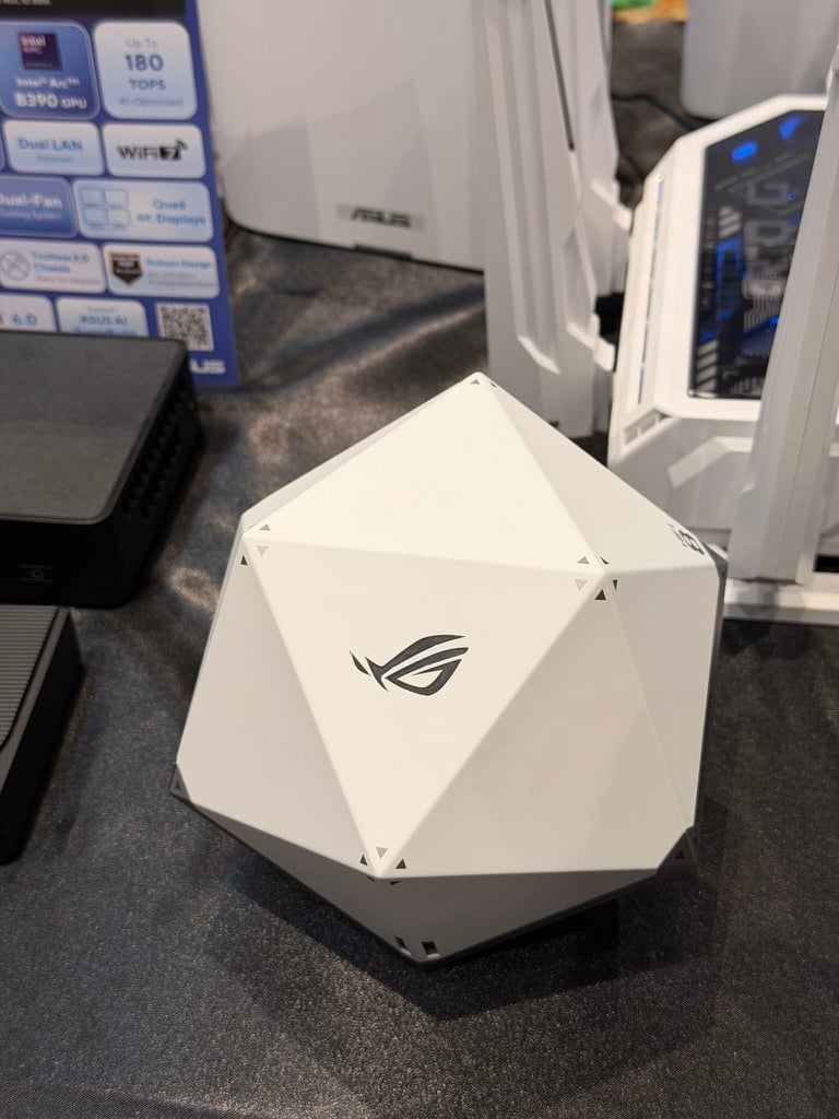 אבל ההפתעה האמיתית בביתן הייתה ה-ROG NeoCore, ראוטר קונספט שמציג לראשונה בעולם את יכולות ה-WiFi 8. במקום העיצוב השטוח המוכר, המכשיר הזה מעוצב בצורת איקוסהדרון (קובייה בעלת 20 פאות), מחווה ברורה לקוביות ה-D20 של שחקני מבוכים ודרקונים. למרות שתקן WiFi 8 (או 802.11bn) עדיין לא אושר סופית, ASUS כבר מדגימה ביצועים בשטח: לא מדובר בהכרח במהירות גולמית גבוהה יותר, אלא ביציבות. ה-NeoCore מבטיח חביון (Latency) נמוך פי 6 וכיסוי IoT כפול בהשוואה לדור הקודם, בזכות ניהול תדרים חכם יותר.
