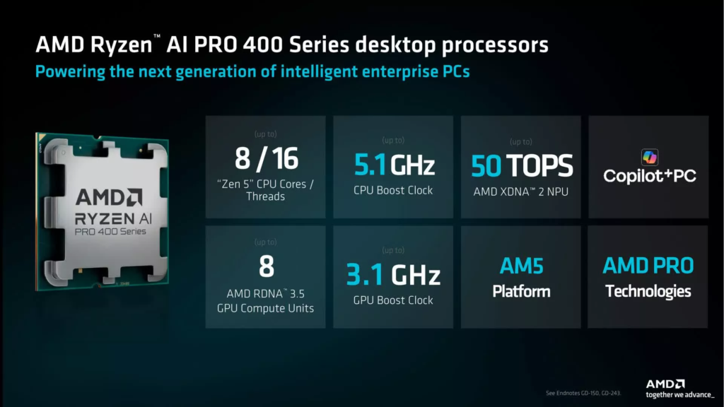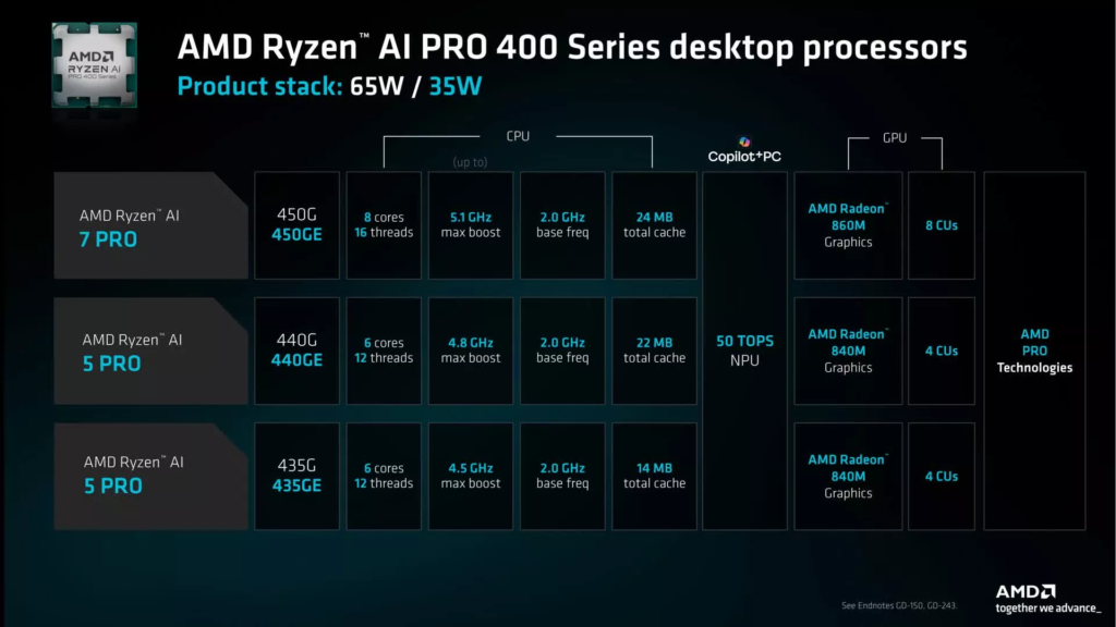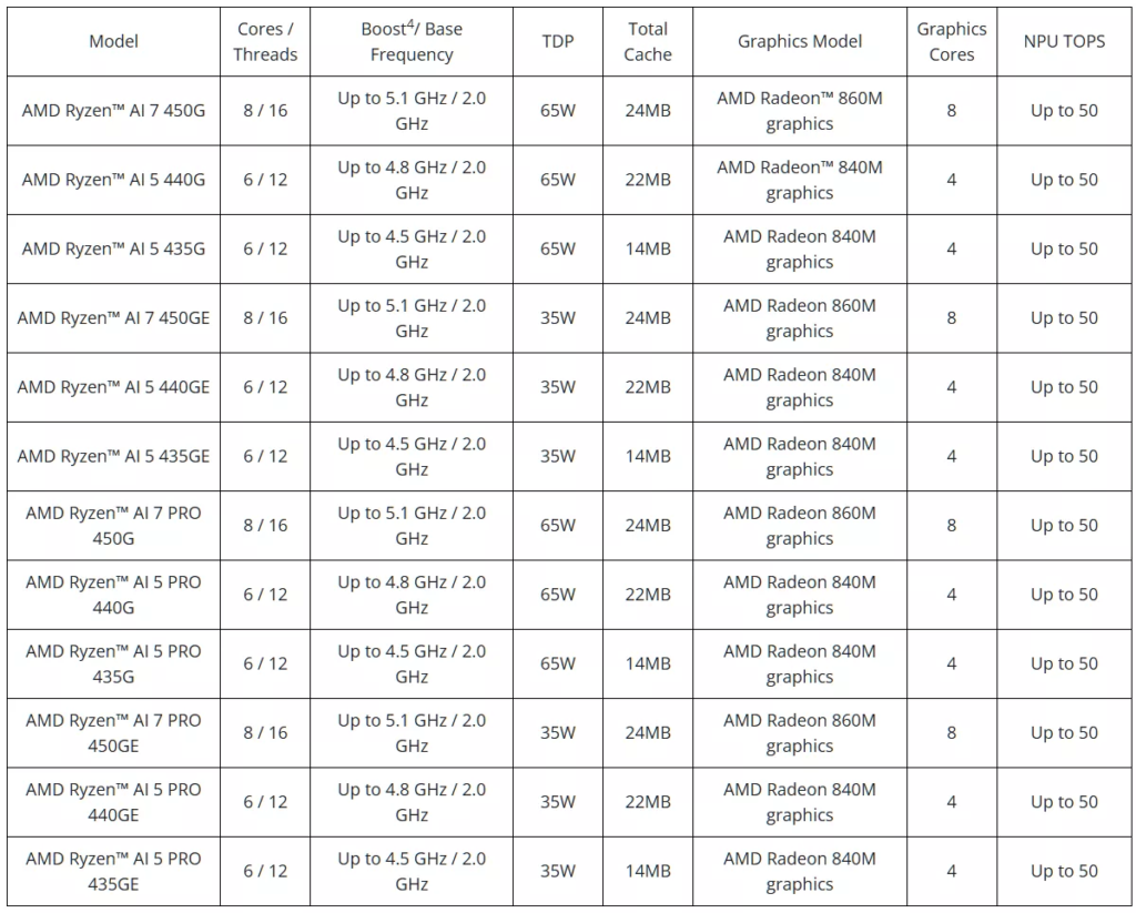 סדרת השבבים החדשה נשענת על שילוב טכנולוגי מדויק הכולל ליבות עיבוד בארכיטקטורת Zen 5, ליבות גרפיות RDNA 3.5 מתקדמות, ומעבד בינה מלאכותית (NPU) מסוג XDNA 2. רכיב ה-NPU מספק קצב ביצועים של 50 טריליון פעולות בשנייה (TOPS), נתון העומד בדרישות החומרה המחמירות לתקן Copilot+ PC של מיקרוסופט. קו המוצרים מפוצל למעשה לשש תצורות שונות, כאשר בקצה העליון ניצב ה-Ryzen AI 7 450G המציע 8 ליבות, 16 תהליכונים, ותדר עבודה מקסימלי של 5.1 גיגה-הרץ.