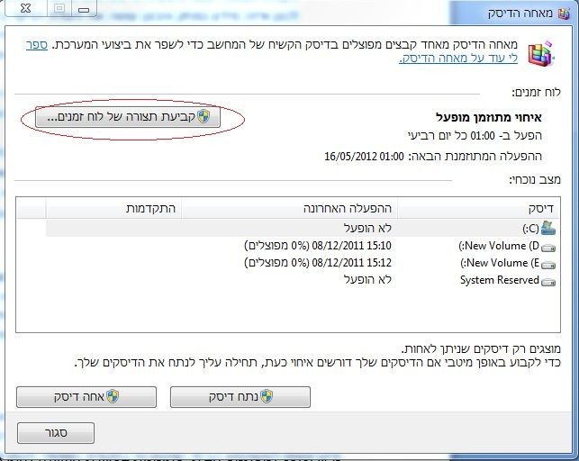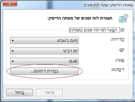 תפריט התחל, משם ל-"תוכניות" > "עזרים" > "כלי מערכת", ושם נבחר ב"מאחה הדיסק" (Defrag). שם נבחר ב-"קבע תצורת לוח זמנים" > "בחירת דיסקים" ונבטל את הבחירה בכונן ה-SSD שלנו. ניתן ומומלץ להשאיר את האפשרות על הכוננים הקשיחים הנותרים במערכת (אם יש).