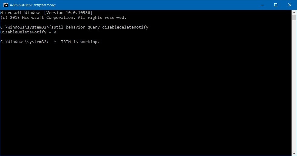 במידה והתוצאה שתוחזר תיהינה הספרה 0, סימן שפקודת TRIM מתפקדת. במידה וקיבלנו את הספרה 1, נריץ את הפקודה "fsutil behavior set disabledeletenotify 0" ונריץ שנית את הפקודה הראשונה על מנת לוודא שהמערכת אפשרה את TRIM.
