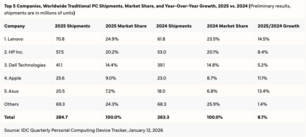 במבט שנתי כולל, שנת 2025 הסתיימה עם 284.7 מיליון מחשבים שנשלחו ברחבי העולם, עלייה של 8.1% לעומת השנה שקדמה לה. לנובו שמרה על מעמדה הדומיננטי בראש הטבלה, כשהיא מחזיקה בנתח שוק של 25.3% ומשלוח של 19.3 מיליון יחידות ברבעון האחרון. מיד אחריה צועדת HP עם כ-20% מהשוק, בעוד Dell, אפל ו-Asus סוגרות את החמישייה המובילה.