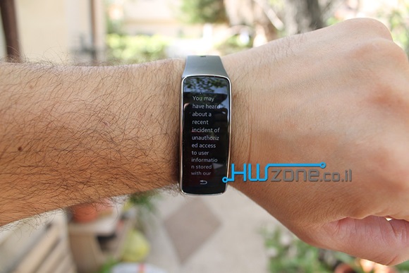 המסך הבאמת יפה ומוצלח של הגיר סובל מבעיה קשה במיוחד, שהיא הגודל הקטן שלו. זה אולי נראה טוב על היד, אבל מסך קטן אומר שפחות מידע יכול להופיע בכל רגע נתון, וכאשר מדובר במכשיר שכל מטרתו היא להציג מידע על היד זאת בהחלט בעיה. התראות מהמכשיר, שהן בעיניי התכונה העיקרית והמעניינת בשעונים חכמים, פשוט נראות לא טוב, בין אם מדובר בגלישת שורה כל שתי מילים או פורמט "שבור" מאפליקציות שהן לא של סמסונג, זה פשוט לא עובד חלק. עדיין אפשר להבין את התוכן, בין אם מדובר בוואטסאפ, ג'ימייל ועוד, אבל אם שלחו לכם תמונה או שאתם מעוניינים באמת לקרוא יותר משתי מילים זריזות אתם תאלצו לפנות למכשיר שלכם.