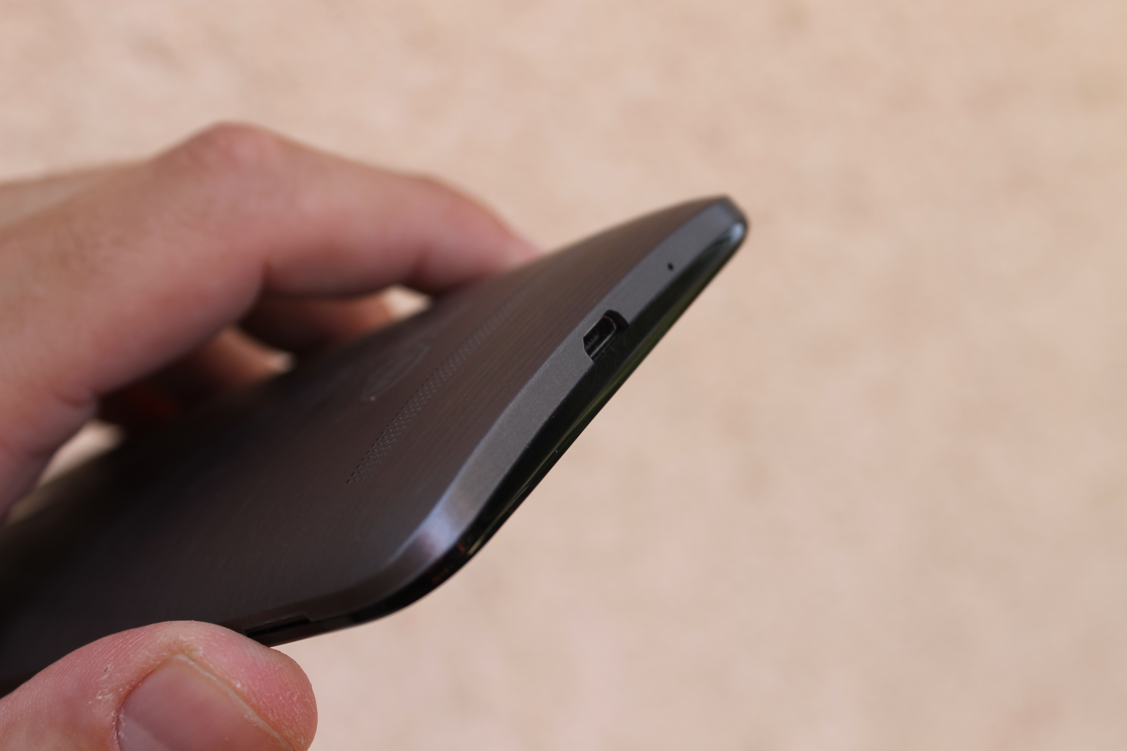 בצד האחורי העיצוב ממשיך עם אותו קו כשגב המכשיר מעוצב פלסטיק קשיח מאוד בעל גימור מאט משוייף, שנראה טוב למדי. בגרסה זו אשר קיבלנו לביקורת הגוון הינו אפור, ועל אף שאינו משעמם אני סבור שהגרסה הזהובה אף יותר מרשימה. אל תתנו לעובדה שמדובר בפלסטיק בגבו להטעות אתכם – זה מרגיש איכותי ונוח לגמרי בכף היד.