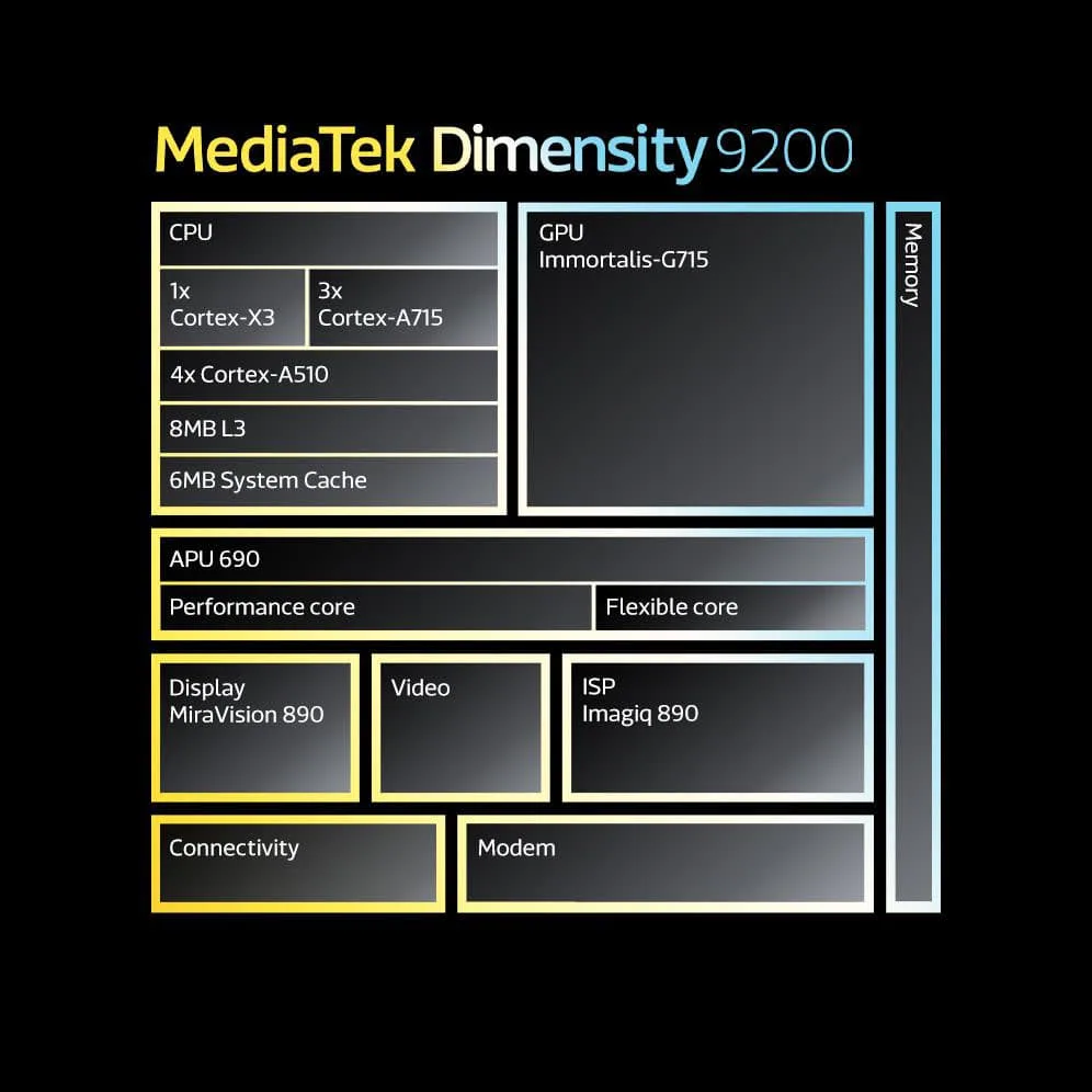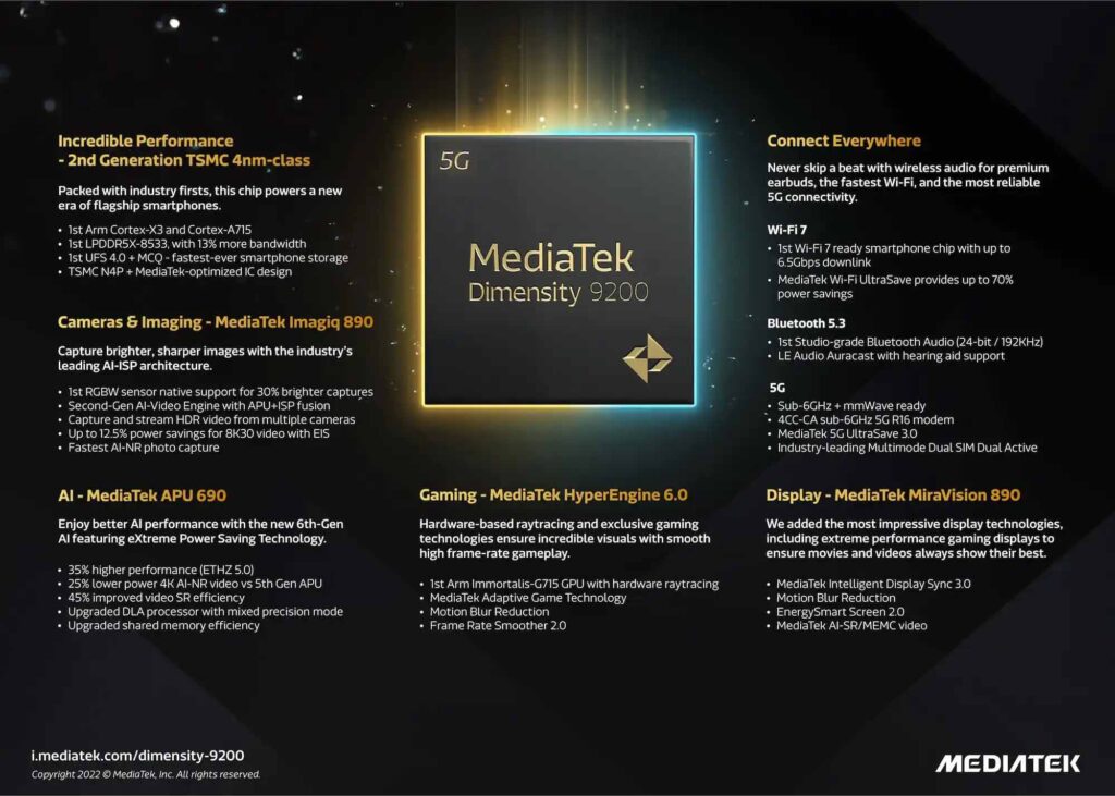 ה-Dimensity 9200 כולל בקר זכרון דינאמי עם ארבעה ערוצי 16 ביט ותמיכה בשבבי LPDDR5X חדשים עם מהירות 4,226MT/s שתעניק שיפור של כ-14 אחוזים ברוחב הפס ביחס לשבבי ה-LPDDR5X המהירים ביותר שנתמכו ב-Dimensity 9000, תמיכה באחסון UFS 4.0 עתידי שיכפיל את מהירויות ההעברה הפוטנציאליות בהשוואה ל-UFS 3.1 המוכר לנו, יחידת האצת חישובי בינה מלאכותית חדשה בשם MediaTek APU 690 שתביא לשיפור של עד 35 אחוזים לעומת זו שקדמה לה, יחידת עיבוד תמונה חדשה שטוענת לתמיכה מובנית ראשונה מסוגה עבור חיישני צילום בסידור RGBW, הכנה לתמיכה עתידית בתקן ה-Wi-Fi 7 עם מהירויות העברה תיאורטיות משוגעות של עד 6.5Gbps ולקינוח תמיכה בתצוגות עם רזולוציית FullHD וקצב רענון של עד 240 הרץ, רזולוציות WQHD עם קצב רענון של עד 144 הרץ ואפילו רזולוציות של עד 5K עם קצב רענון סטנדרטי יותר של 60 הרץ.