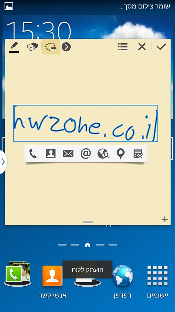 כאשר תשלפו את העט ממקומו, ייפתח תפריט על גבי המסך אשר יכיל ארבע אפשרויות. הראשונה שבהן היא "תזכיר פעולה". על המסך נפתח ממשק של פתק שעליו אתם כמובן יכולים לכתוב. הרעיון הוא כתיבת פיסת מידע שיש בה שימוש כמו מספר טלפון, שם, כתובת וכו'. לאחר מכן, ניתן באמצעות תפריט הפעולה לשייך את אותו מידע לפעולה ספציפית. למשל לנווט לכתובת שהכנסתם, לשמור טלפו לאנשי הקשר, לפתוח דף אינטרנט, לשלוח מייל וכו'. כל הפתקים הללו נשמרים באופן אוטומטי וניתן לגשת אליהם לאחר מכן. מדובר באפליקציה נהדרת, אשר לוכדת בצורה מצויינת את השימוש העיקרי בעט כלשהו, פתקים מהירים כדי לשמור מידע בצורה מהירה. אני יכול לדווח שהאפליקציה עובדת בצורה מצויינת, כל עוד אתם לא מנסים לכתוב בה בעברית. משום מה, למרות שבמקומות אחרים במערכת ניתן להכניס קלט בעברית, אפליקציה זו, כנראה השימושית ביותר לשימוש עם העט, לא עובדת בעברית. נקודה רעה מאוד לסמסונג ישראל. היא כן תזהה לכם מספרי טלפון למשל, אבל טקסט בעברית הוא סינית בשבילה…