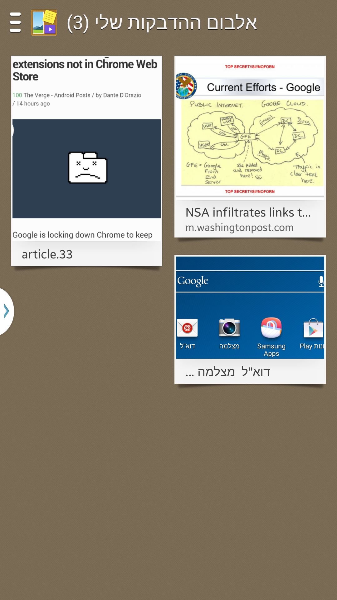 האפליקציה הבאה היא מנהל אלבום ההדבקות. הרעיון הוא נחמד מאוד: מצאתם משהו שמעניין אתכם באינטרנט? הפעילו את האפליקציה, הקיפו אותו בעיגול והאובייקט עצמו יישמר לכם. לאחר מכן תוכלו כמובן לתייג אותו לפי קטגוריות, לצפות במקור שלו ואפילו לשתף אותו כמו כל אובייקט אחר במערכת. חביב.