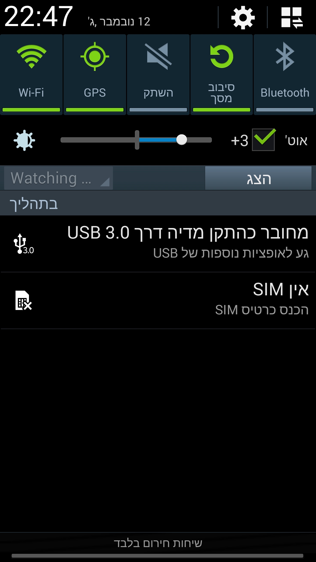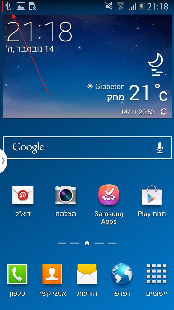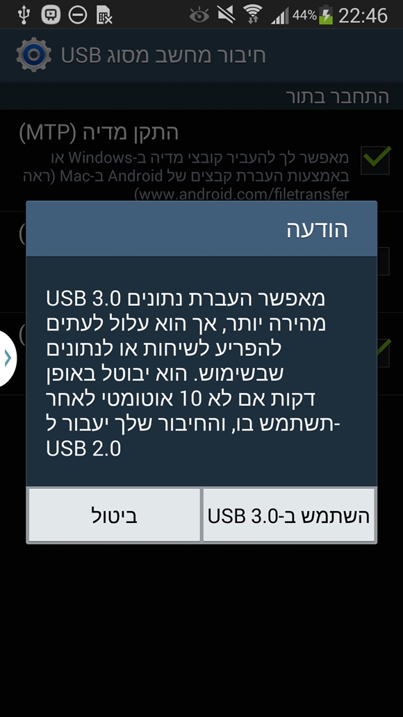 הנוט 3 מתהדר כאמור בחיבור USB 3, הסמראטפון הראשון בעולם שעושה שימוש בפרוטוקול הזה, שמטרתו כמובן היא העברת קבצים מהירה יותר, למרות שהשימוש במצב זה קצת חבוי מדי לטעמי. לאחר שחיברתי את המכשיר למחשב קיבלתי הודעה שהוא עובד במהירות של USB 2.0 ושהוא יכול לעבוד במהירות גבוהה יותר. אחרי הרבה זמן מעצבן של לנסות להבין את הבעיה נתקלתי במדריך באינטרנט שאומר שיש צורך ללחוץ במסך ההתראות על ההודעה של חיבור למחשב ואז לבחור את האפשרות של USB 3.0. למה זה לא מופעל כברירת מחדל אתם שואלים? ובכן, על פי הודעת האזהרה של סמסונג, השארת המכשיר במצב זה עלולה להפריע בפעולה תקינה של המכשיר, אין לי מושג למה. הם אפילו מציינים שמצב זה ייכבה לאחר כ-10 דקות שבהן אין העברת קבצים מהמחשב למכשיר. כדי לוודא שאתם באמת מחוברים במצב USB 3.0 שימו לב לאייקון בשורת הסטטוס.