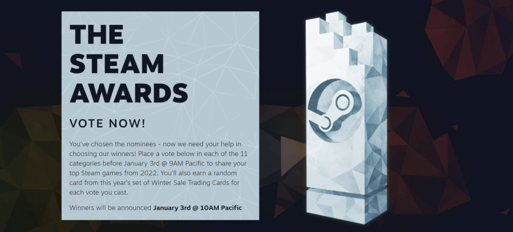 עכשיו יהיה זמין טוב להקדיש כמה דקות להצבעה על המשחקים המובילים ב-Steam בשנת 2022 מנקודת המבט שלכם – אחרי שהמועמדים גובשו וכמעט הכל כבר מוכן להכרזה על המנצחים המאושרים בימים הראשונים של 2023.