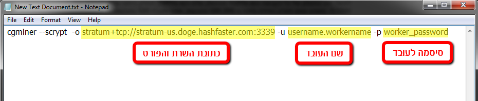 את הכורה יש להגדיר מראש עם אותו הקובץ שנייצר מהקבוצה. את ההדגמה נבצע על CGminer. לאחר שהורדנו את התוכנה וחילצנו את הקבצים, ניצור קובץ txt חדש בתוך התיקיה. בתוך הקובץ נכניס את ההגדרות לכורה שלנו. הקובץ אמור להיראות כך: