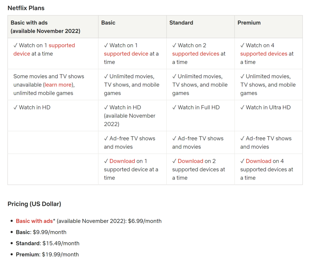 על פי טבלת ההשוואה המועילה בין המסלולים השונים, נראה כי בנוסף להגבלות על איכות התצוגה ועל מספר אמצעי התצוגה הזמינים בחשבון, המינוי החדש עם הפרסומות לא בהכרח יכלול את מלוא התכנים הזמינים עבור שאר המינויים היקרים יותר (כאשר עדיין לא לגמרי ברור האם יהיה מדובר בהבדל זניח או במחסור משמעותי של תכני צד ג' שאינם בלעדיים מנטפליקס עצמה) וכמו כן לא יכלול את האפשרות להוריד סרטים וסדרות לטובת צפייה בשלב מאוחר יותר כאשר לא בהכרח קיים חיבור אינטרנט מתפקד זמין.