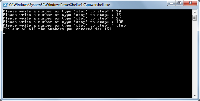 $number = Read-Host "Please write a number or type 'stop' to stop: "