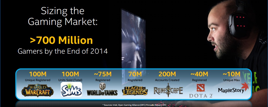 בכנס זה היה חשוב לאינטל להראות כמה שוק הגיימינג במחשב האישי צומח עם דוגמאות למשחקים הפופולריים ביותר כיום. על פי נתונים אלו, ישנם מעל ל-700 מליון אנשים כיום שמשתמשים במחשב לצורכי בידור ומשחקים בפרט. נתון זה מחזק בעיקר את היכולת של אינטל לדחוף מוצרים דוגמת מעבדים מתקדמים לגיימרים וליצרניות המשחקים מצד שני להפיק כמה שיותר משחקים למחשב האישי למטרות רווח. מלבד המעבדים, בשנים האחרונות עושה אינטל רבות כדי לשפר את חוויית הגרפיקה גם לאלו שמעדיפים להשאר ללא כרטיסי מסך. עם דורות המעבדים החדשים, יחידות עיבוד הגרפיקה שנמצאות בתוך המעבדים עצמם מתחזקות באופן משמעותי מדור לדור. כאן, ניתן לראות כי אפשר להינות מהכח שהן מספקות אפילו במשחקים חדשים. עדיין לא מדובר בכח שתמצאו בכרטיסי מסך המיועדים לכך, אך הפעם מצטמצם מדור לדור.