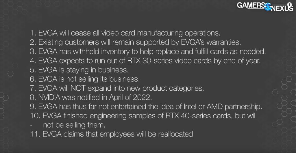 על פי מה שידוע ל-Gamers Nexus, ב-EVGA יעצרו באופן מוחלט את יצור כרטיסי המסך, לא מתכננים להמשיך לסדרה הקרובה ולא מתכוונים לחזור. ב-EVGA מתארים שהעבודה על בסיס מוצרי NVIDIA הפכה לבלאגן עבור עובדי החברה והמנהלים בה, אשר לא יודעים מתי מוצרים יצאו וכמה הם יעלו. כתוצאה מכך, גורל הכנסות החברה תלוי לחלוטין בהחלטות NVIDIA ובתלותה.