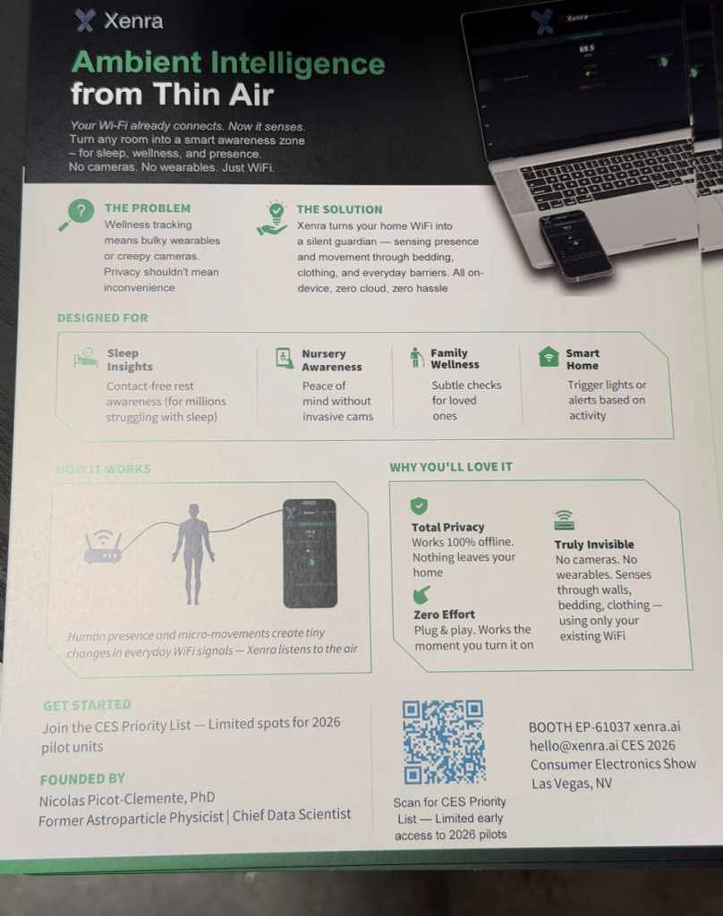 זוכרים שרק לפני רגע התלהבנו מחגורה חכמה ששומרת על הגיל השלישי מנפילות? אז בביתן של XENRA החליטו שגם זה יותר מדי מאמץ. הסטארטאפ החדשני הזה מציג ב-CES חזון שנקרא "Ambient Intelligence" (אינטליגנציה סביבתית), והוא מבוסס על רעיון כמעט קסום: האוויר סביבנו מלא בגלי רדיו, ולכל תנועה שלנו – אפילו נשימה זעירה – יש השפעה עליהם. במקום להעמיס עלינו עוד גאדג'טים לבישים שצריך להטעין כל לילה, XENRA הופכת את הראוטר הביתי לסורק רפואי מתקדם.