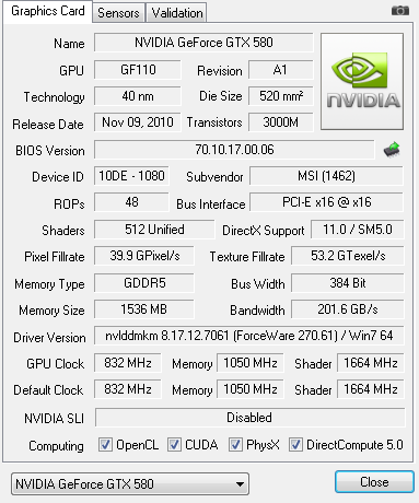 כרטיס המסך מדגם Geforce GTX580 מבוסס על ליבת GF110 שלמה ומלאה, מה שאומר שלא בוצע שום תהליך הנמכת ביצועים במפעל. ליבת ה-GF110 היא למעשה ליבת GF100 משופצת אשר עברה תהליכי ייעול צריכת חשמל. הליבה מכילה 512 מעבדי CUDA הפועלים בתדר של לא פחות מאשר 722 מגה-הרץ. הליבה כוללת 48 יחידות ROP, מכילה כ-3 מיליארד טרנזיסטורים ומיוצרת בתהליך של 40 ננו-מטר. בכרטיס המסך כמות זיכרון גרפי של 1,536 מגה-בייט בטכנולוגיית GDDR5 הפועל בתדר של 1,002 מגה-הרץ (4,008 מגה-הרץ אפקטיבי).