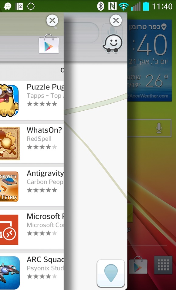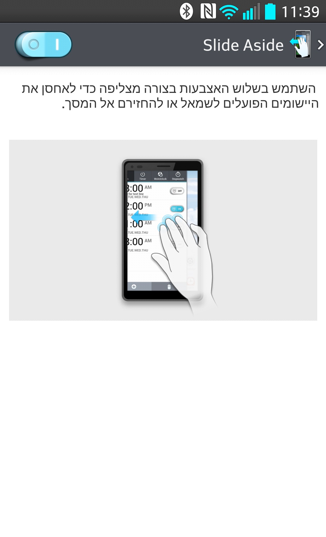 תכונה נוספת אחרת שניתן למצוא נקראת Slide Aside. ניתן לעשות החלקה עם שלוש אצבעות על מסך המכשיר לצד שמאל ולשמור כל אפליקציה שתרצו לשליפה מהירה, מעין דרך להפעיל 3 תוכנות בצורה קצת יותר מהירה אבל הרבה פחות נוחה לטעמי.