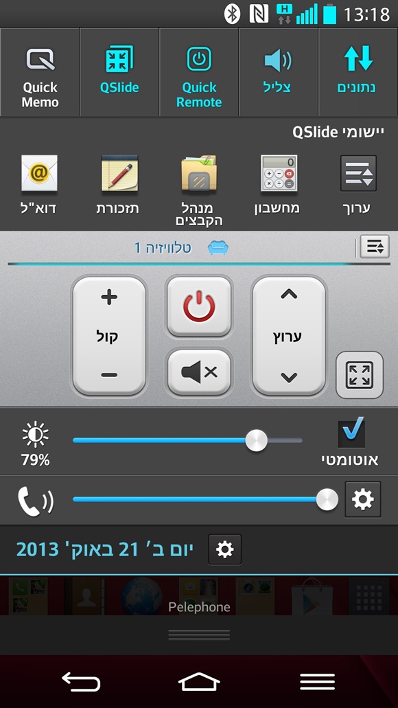 אך ישנם כמה מקומות שבהן LG החליטה לבדל את עצמה. הראשון שבהם הוא ה-QSlide. ה-QSlide הוא התשובה של LG למסך Multi-Windows של סמסונג. ישנה רשימה קבועה של אפליקציות מערכת שניתן להפעיל במצב מרחף. כל אפליקציה שכזו מגיעה עם סליידר בחלקה העליון שקובע את רמת השקיפות שלה ולכן השם QSlide. בכל מצב נתון ניתן להגדיל למסך מלא אפליקציה שכזו או לחילופין, למזער למצב חלון מרחף אפליקציה שתומכת בכך. זהו יישום נחמד, שמאפשר לנצל באופן טוב יותר את הגודל המכובד של המסך הזה. באופן אישי קשה לי להשתחרר מההרגלים של לעבוד במצב של מסך מלא, במיוחד שהמכשיר מהיר כל כך ומעבר בין אפליקציה לאפליקציה לוקח זמן מזערי. אך אין לי ספק שרבים מכם יאהבו את התכונה הזו.